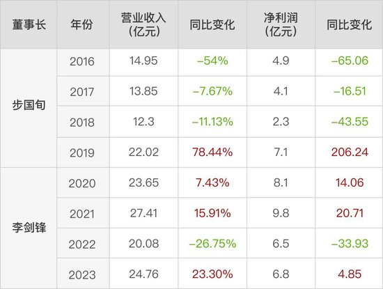 虽然步国旬在南京证券任职近30载,不过其担任南京证券董事长一职的时间并不长,只有6年左右。和继任董事长李剑锋相比,步国旬任期内的业绩起伏较大。
