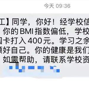 短信中写道:经学校信息统计分析,你的BMI指数偏低,学校已向你的校园卡打入400元。学习之余,一定要照顾好自己。你的健康是我们最大的牵挂!