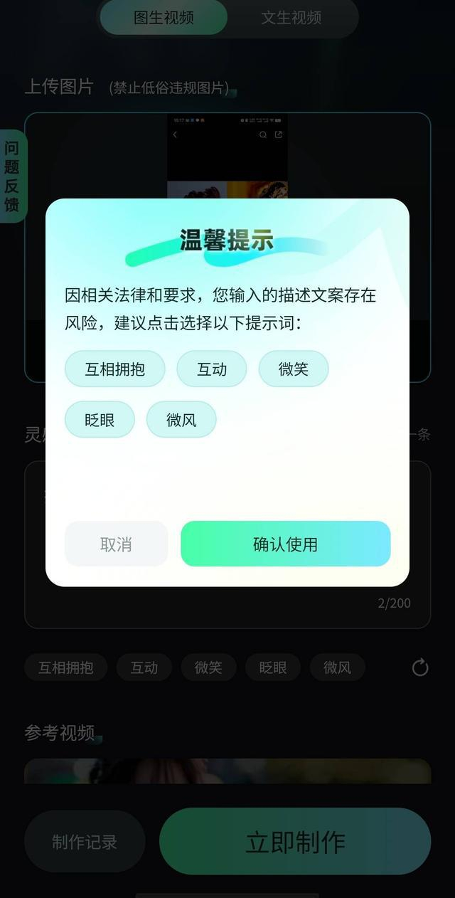 “很多国内大厂商都在做这种图转视频,我们的功能不是给他们做亲吻的,我们也没对外专门宣传产品主打亲吻功能,很多是用户自主行为,我们也不鼓励这个做法,发现后也采用各种手段提示,最后只能禁止掉。”工作人员称。