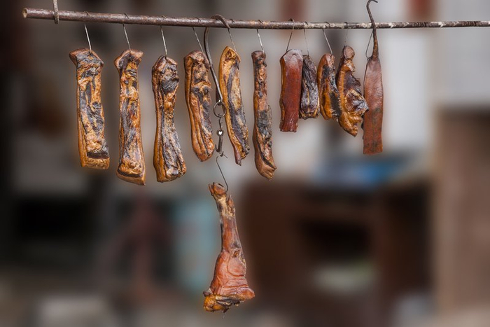 然而,腌肉可不简单,有饭店老板此前向新京报记者介绍,以四川、湖南、广东等地流行的腊肉为例,选材上需精选五花肉或后腿肉,确保肥瘦相间,口感更佳。腌制过程中,需将肉洗净沥干,再用盐、花椒、八角、桂皮等香料腌制数日,其间还需不时翻动肉块,确保每一块都能均匀入味。待腌制完成,将肉块挂在通风良好的地方晾晒,直至表面干燥、肉质紧实,腊肉才算制作完成。