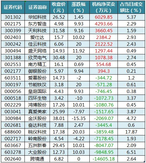 龙虎榜机构净买入9股华如科技居首