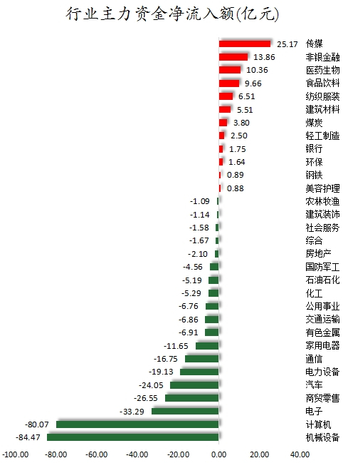 从行业来看,申万所属的31个一级行业,今日有12个行业主力资金呈现净流入,其中,传媒行业主力资金净流入最多,净流入金额为25.17亿元;行业主力资金净流入居前的还有非银金融、医药生物、食品饮料,净流入金额分别为13.86亿元、10.36亿元、9.66亿元。19个行业主力资金呈现净流出,其中,机械设备行业主力资金净流出最多,净流出金额为84.47亿元;行业主力资金净流出靠前的还有计算机、电子、商贸零售、汽车、电力设备,净流出金额分别为80.07亿元、33.29亿元、26.55亿元、24.05亿元、19.13亿元。