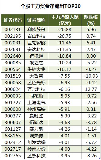 今日有3037只个股被主力资金净卖出,其中,117股被主力资金净卖出超1亿元。主力资金净流出最多的个股是利欧股份,净流出金额为20.88亿元;主力资金净流出居前的个股还有岩山科技、巨轮智能、奋达科技、跨境通、银之杰,净流出金额分别为20.75亿元、11.46亿元、11.35亿元、10.84亿元、10.24亿元。