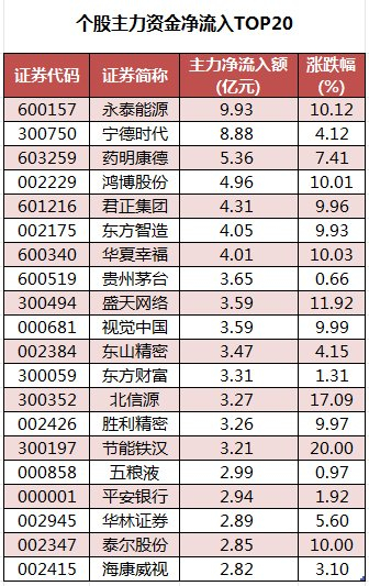 个股来看,今日有2067个股获主力资金净流入,其中,96股获主力资金净流入超1亿元。永泰能源主力资金净流入最多,净流入金额为9.93亿元;主力资金净流入居前的个股还有宁德时代、药明康德、鸿博股份、君正集团、东方智造,净流入金额分别为8.88亿元、5.36亿元、4.96亿元、4.31亿元、4.05亿元。