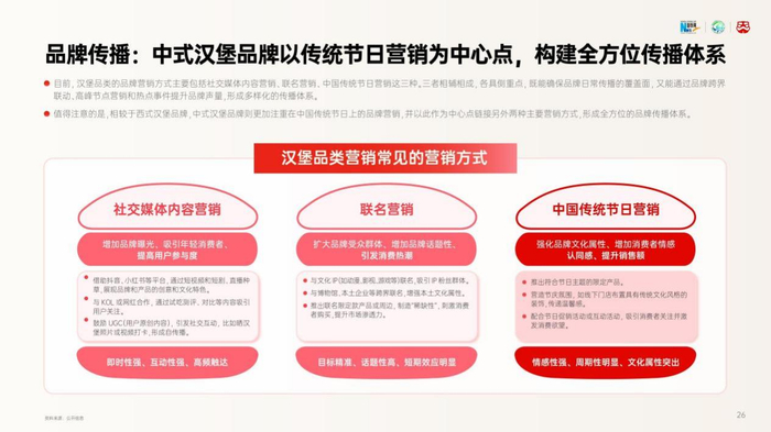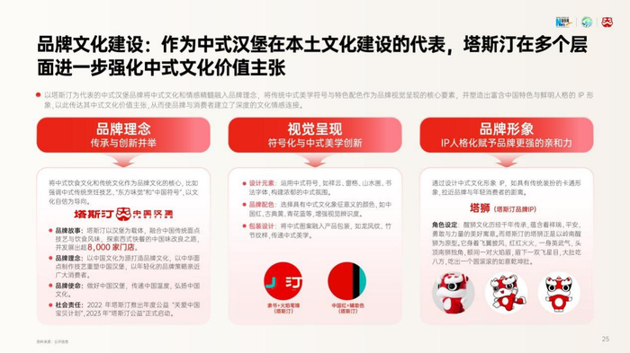 《2024中式汉堡品类发展报告》总结中式汉堡品类的发展特点有三,分别是产品着重强调“中国味”、品牌文化建设着重中国传统文化的融合、品牌传播以中国传统节日为核心。以塔斯汀为代表的中式汉堡品牌将传统文化和情感价值融入品牌理念,将传统中式美学符号与特色配色作为品牌视觉呈现的核心要素,并塑造出富含中国特色与鲜明人格的IP形象,以此传达其新中式价值主张,从而使品牌与消费者建立了深度的文化情感连接。