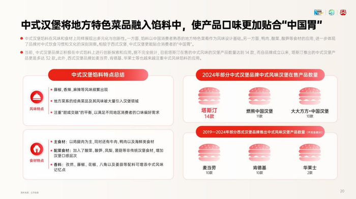 什么是“中式汉堡”?《2024中式汉堡品类发展报告》指出,以塔斯汀为代表的部分本土西式快餐品牌,通过对汉堡的堡胚、内馅、配菜以及风味多个维度进行中式化改良与创新,成功开创了中式汉堡这一条全新的细分赛道。通常,中式汉堡使用门店手擀现烤堡胚,选用地域特色美食佳肴做汉堡馅,以更好满足中国消费者需求,同时会在西式汉堡的基础上添加菌菇、紫甘蓝等更贴合中国消费者口味的配菜,在酱料的选择上也针对地域风味进行了更多的探索,以迎合中国人的饮食习惯。
