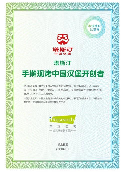 *本文所涉报告数据及内容均来自《2024中式汉堡品类发展报告》(新华网和中国农业科学院农产品加工研究所、塔斯汀联合编写)及《2024中国汉堡行业白皮书》(塔斯汀联合新华网、艾瑞咨询共同发布)。