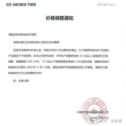 与此同时,耐克森轮胎也宣布了调价通知。对16寸及以上规格的轮胎进行价格调整,调整幅度为2.0%至3.0%。对于15寸及以下规格的轮胎,将减少2.0%的销售返利支持。新的价格表从2024年12月1日开始执行。这些调价措施凸显了轮胎行业普遍面临的成本压力,制造商们正通过提高销售价格来分担这一负担。