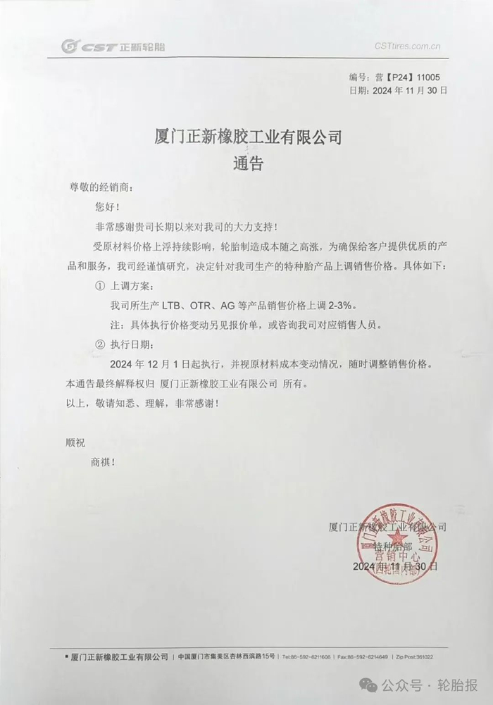 在多种因素的叠加作用下,轮胎价格上涨已成为不可避免的趋势。截至11月30日,由于原材料成本持续攀升,轮胎的生产成本亦随之提高。为确保向客户持续提供高品质的产品与服务,正新轮胎在深入研究和审慎考虑后,决定对其特种轮胎产品线,包括LTB、OTR、AG等系列,实施2%至3%的价格上调。这一新的价格体系于2024年12月1日起正式生效。