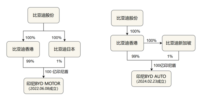根据比亚迪2024年发布的公告,其在印尼共设有两家子公司,PT BYD MOTOR INDONESIA (BYD MOTOR)和PT BYD AUTO Indonesia (BYD AUTO),股权结构如下图所示。两家印尼子公司的股权架构设计体现了多方面的法律考量。