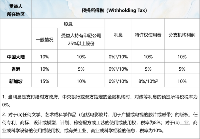 其次,在股东的选择上,两家公司的控股股东均为比亚迪体系内的一家香港子公司,这样的安排旨在利用香港与印尼之间的税收协定,以便享受更优惠的税务待遇。资金跨境转移涉及的税务问题是企业设计跨境投资架构时的关注重点。通常情况下,中国企业在进军东南亚市场时,会选择在新加坡或香港设立子公司作为持股平台。对比中国大陆公司直接投资、通过香港公司持股以及通过新加坡公司持股三种不同投资路径下的预提所得税税率,可以发现,对于中国企业来说,香港是投资印尼的最佳中转站。如下图所示,若香港公司持有印尼公司25%以上的股份,那么印尼公司向香港公司支付股息时所需缴纳的预提所得税税率仅为5%。此外,在特许权使用费和分支机构利润汇出方面,通过香港公司再投资同样能够享受更优惠的税率。