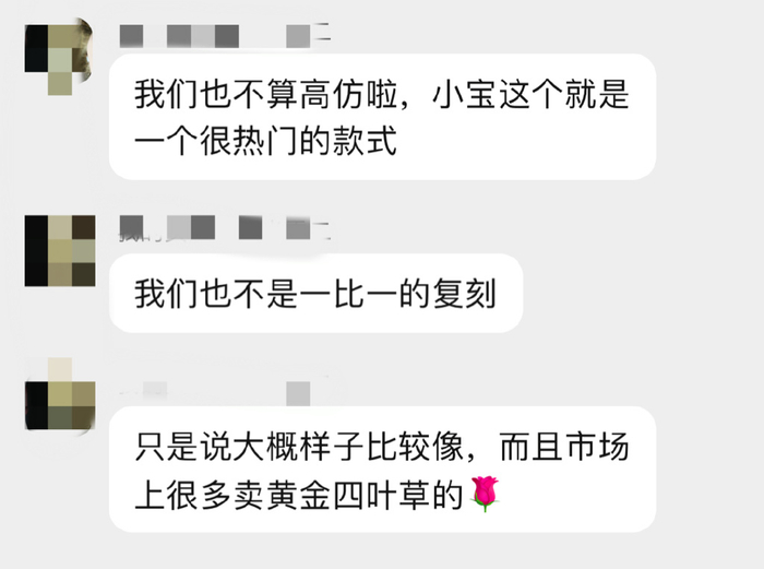 随后,记者还联系了两家售卖“四叶草”系列的商户,尽管造型非常相似,但都回避说品牌高仿,而是以“可以下单回去看实物,支持七天无理由退货”来回答。