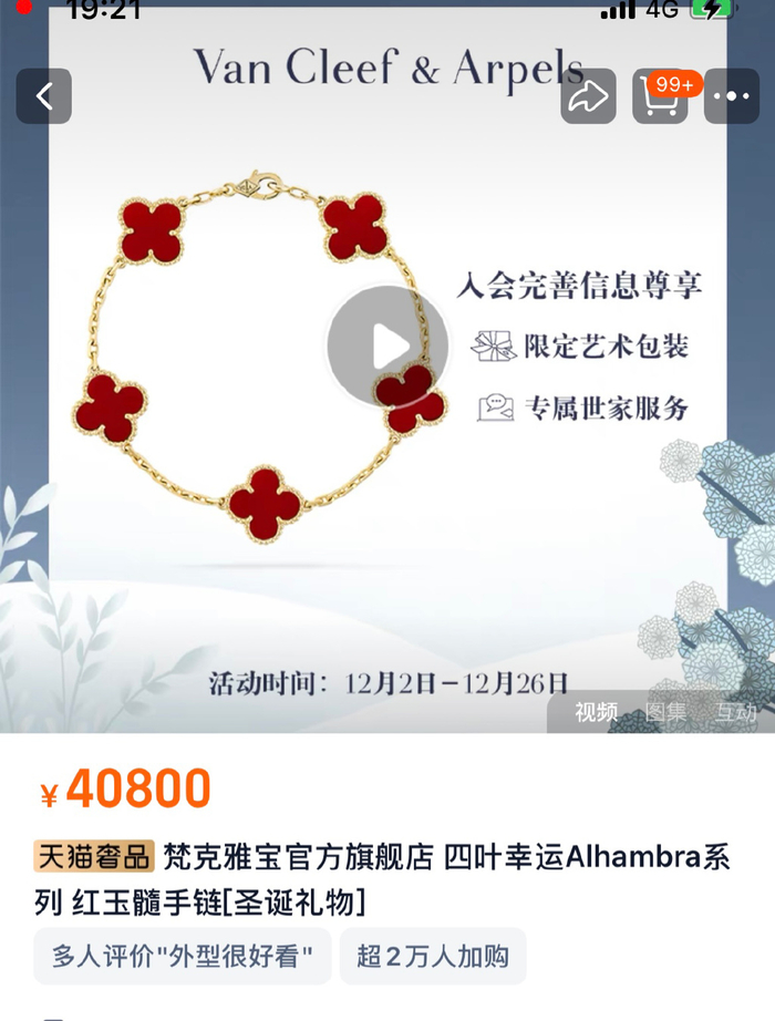 12月6日,记者线上联系到了水贝市场一家黄金饰品店,与梵克雅宝造型极为相似的五花“四叶草”手链售价为3880元,与官网4.08万元的售价相差十倍。商家表示,该款手链不会摆在线下柜台售卖,当记者询问是否为高仿时,该商家表示“我们也不是一比一复刻,只是说大概样子比较像”。