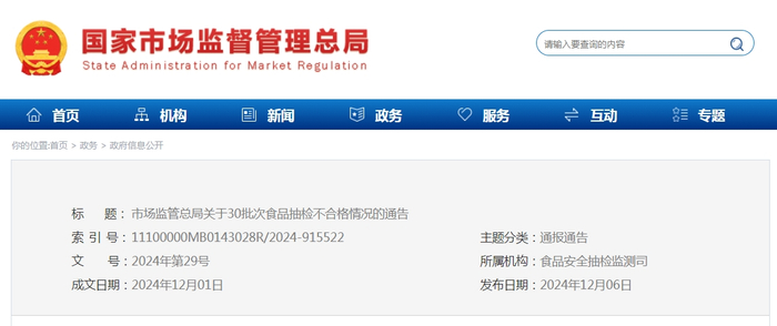 市场监管总局关于30批次食品抽检不合格情况的通告