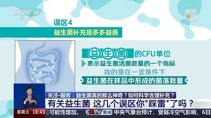 第四个误区:益生菌补充是多多益善。我们经常在益生菌产品上,看见CFU标记。益生菌的CFU单位是用来表示益生菌活菌数量的一个指标。它指的是在一定条件下,益生菌在样品中形成的菌落数量。商家对于益生菌的宣传动辄含有8000亿(CFU)、1万亿(CFU)的数量,先不论拿到消费者手中真正还有多少活菌,单就益生菌本身而言,并不是补充越多越好。