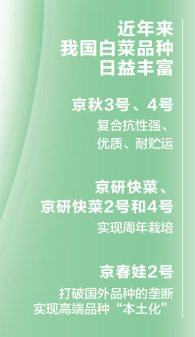 近年来,我国白菜育种实力突飞猛进,品种日益丰富,实现了从单一“秋播冬贮”向优势产区生产、产品多样化和周年生产转变。培育出了复合抗性强、优质、耐贮运的品种“京秋3号、4号”等,高品质、速生苗用品种“京研快菜、京研快菜2号和4号”3个品种搭配实现了周年栽培,解决了生产上长期缺乏冬春和夏季栽培专用品种的难题。还育成了娃娃菜、快菜、绍菜、金丝白等高品质品种,尤其是“京春娃2号”一举打破国外品种的垄断,它比国外品种早熟5至7天,种植密度高25%,亩收入增长30%,已成为国产娃娃菜第一大品种,实现了高端品种的“本土化”。