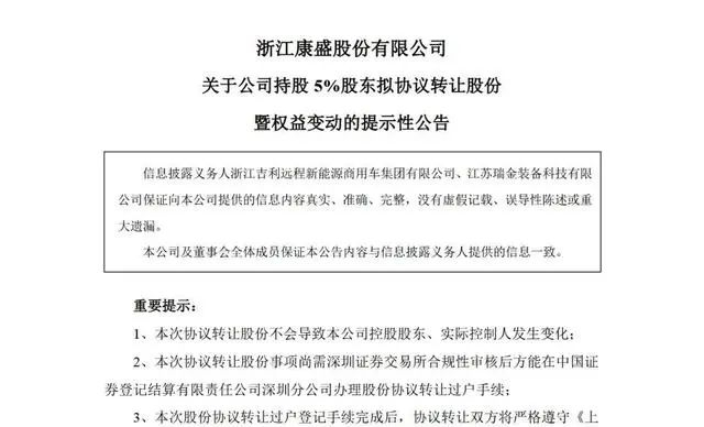 近日,浙江吉利远程新能源商用车集团有限公司(以下简称“吉利商用车”)宣布清仓所持浙江康盛股份有限公司(以下简称“康盛股份”)股份,标志着吉利创始人李书福正式退出康盛股份及与“中植系”长达3年的合作。
