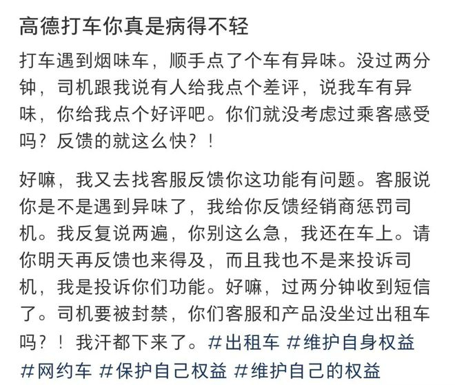 陈晨认为,高德打车平台投诉反馈机制设计不合理,“你们客服和产品没坐过出租车吗?我汗都下来了。”