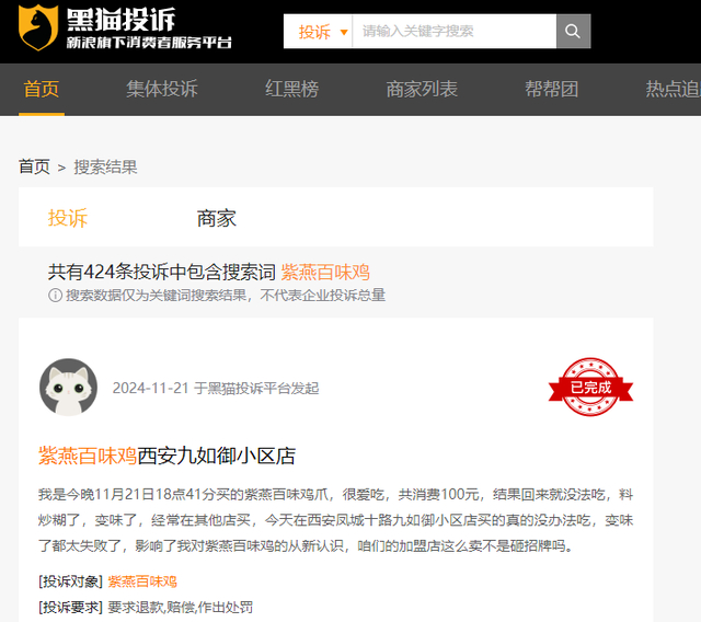 而在本次事件之外,其实有关紫燕百味鸡的食品安全问题并不罕见。黑猫投诉中有424条有关紫燕百味鸡的投诉,其中也有很多有关食品安全监督问题的投诉。