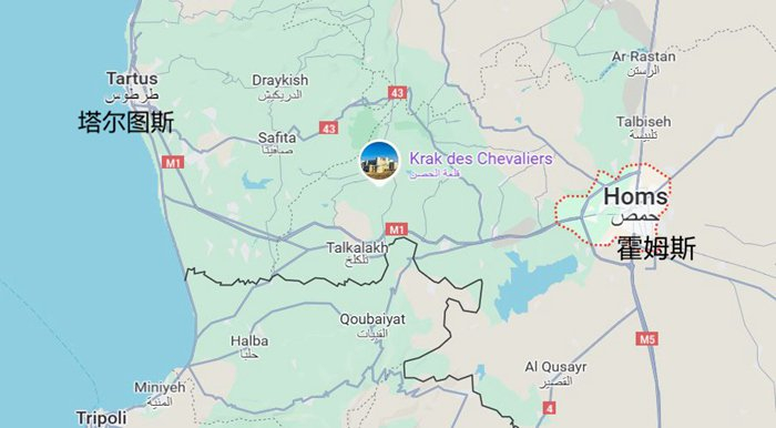从霍姆斯往西可以经M1高速公路前往地中海畔的塔尔图斯。苏联1971年就在塔尔图斯港设立了军事基地,目前塔尔图斯港是俄罗斯在地中海的唯一海军基地,也是在海外唯一的海军基地,为俄罗斯制衡北约的重要据点。俄罗斯在叙利亚西部的拉塔基亚省还有赫梅米姆空军基地,是俄罗斯在该国的最大空军基地。
