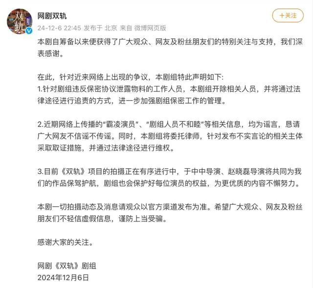 12月6日晚,网剧《双轨》发布声明称,针对剧组违反保密协议泄露物料的工作人员,本剧组已开除相关人员,并将通过法律途径进行追责。网络上传播的“霸凌演员”“剧组人员不和睦”等相关信息,均为谣言,本剧组将委托律师通过法律途径进行维权。