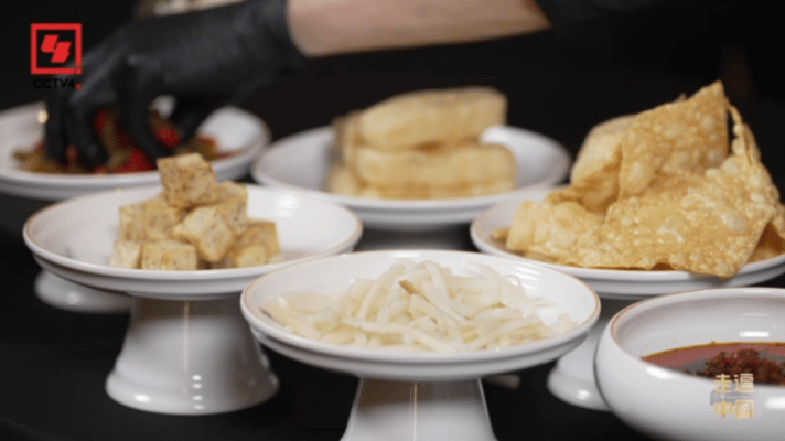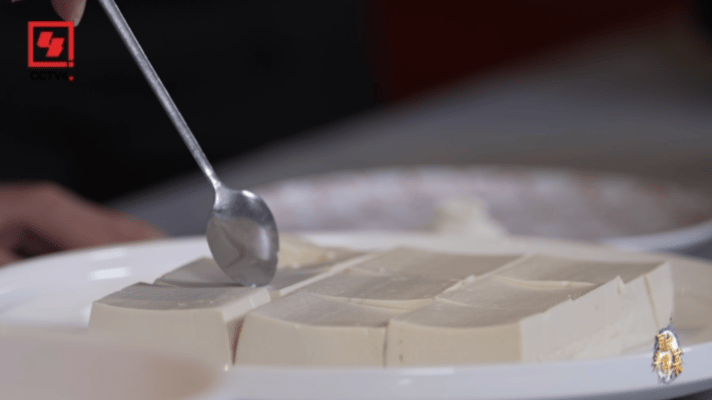 广西酿菜文化十分丰富,豆腐酿在其中极具代表性,梁艺馨也亲自上手体验制作过程。在豆腐上挖洞这一看似简单的工序却颇有技巧性,挖得太深就会导致底部破损,梁艺馨初试失败后耐心细致再次尝试便掌握了诀窍。挖好豆腐填上调制好的肉馅就要入锅,加入鸡汤煎至表皮金黄,一道石磨豆腐酿就出锅了!