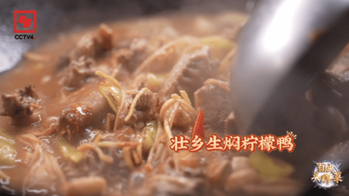 柠檬鸭是一道南宁非遗菜品,壮乡生焖柠檬鸭选用当地独特品种的散养土鸭,先将姜下锅炒出香味,鸭肉炒至金黄,随后放入米酒和水小火慢焖,最后加入核心的柠檬酱,味道微酸微辣,令人食欲大开。
