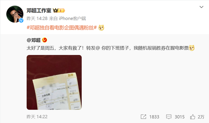 12月6日,邓超在社交平台发了自己在电影院观看《胜券在握》的照片,并表示会随机报销粉丝的电影票。