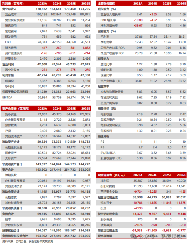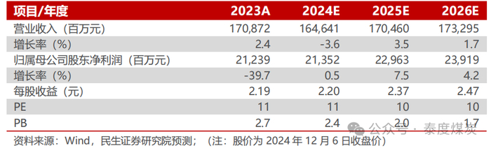公司资源禀赋行业领先,成本优势明显,现金奶牛属性强,长期投资价值高,我们预计2024-2026年公司归母净利为213.52/229.63/239.19亿元,对应EPS分别为2.20/2.37/2.47元,对应2024年12月6日收盘价的PE分别为11/10/10倍。维持“推荐”评级。