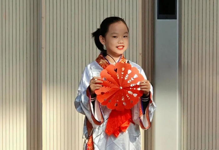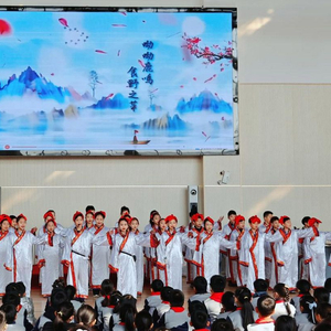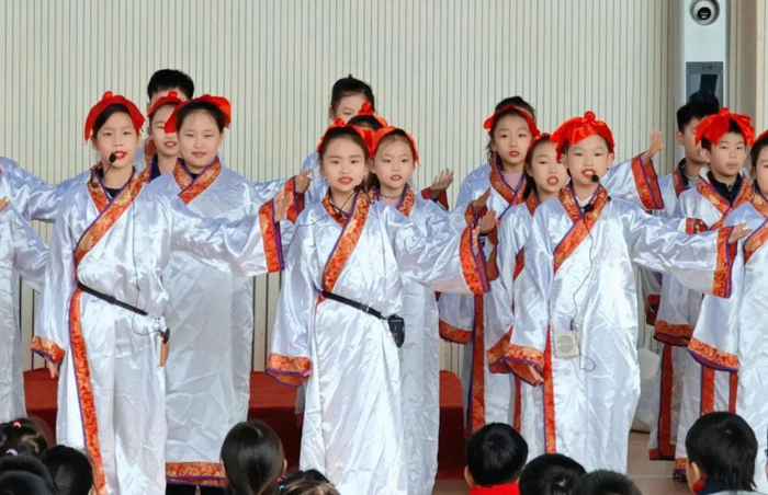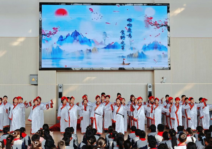 “呦呦鹿鸣,食野之苹;我有嘉宾,鼓瑟吹笙。”四年级十二班的同学身穿汉服,用清亮的声音吟诵《诗经·鹿鸣》,生动地演绎了宾主之间琴瑟歌咏、互敬互融的情景,令人耳目一新。
