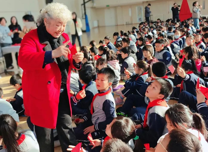 李文玲奶奶穿梭在孩子中间,耐心指导、鼓励每一位学生。同学们围在李奶奶身边,举手提问:“李奶奶,您看我剪得对吗?”“李奶奶,我的对折正确吗?”李奶奶耐心回应:“别着急,静下心来慢慢剪。”“很好,剪得不错!”剪纸结束后,同学们展示自己的作品,并与老师和同学们分享剪纸的乐趣。