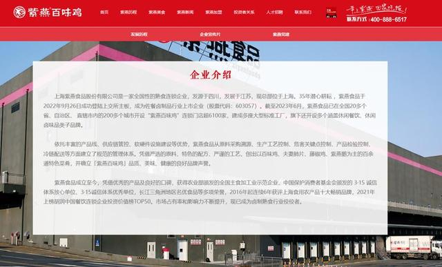 据公开资料显示,上海紫燕食品股份有限公司是一家全国性的熟食连锁企业,总部位于上海市闵行区莘庄工业区申南路215号。截至2023年6月,紫燕食品已在全国200多个城市开设“紫燕百味鸡”连锁门店,总数超6100家。