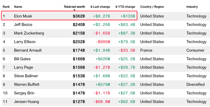 马斯克也是今年财富增加最多的富豪,紧随其后的是Meta首席执行官马克·扎克伯格,后者今年身价增长了873亿美元,达到2150亿美元,在富豪榜上排名第三。另外,英伟达CEO黄仁勋今年财富增加了826亿美元,增幅仅次于马斯克和扎克伯格,黄仁勋的最新身家为1270亿美元,目前在富豪榜上排在第11位。