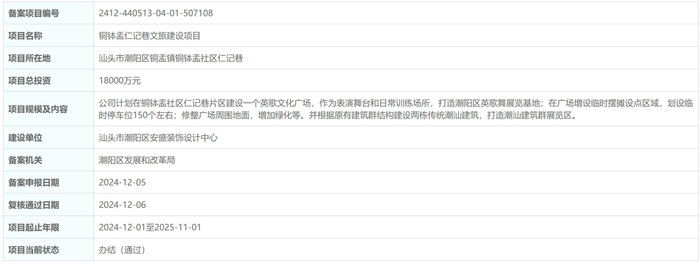 ● 据广东省投资项目在线审批监管平台消息,近日,铜钵盂仁记巷文旅建设项目备案通过。铜钵盂仁记巷文旅建设项目位于汕头市潮阳区铜盂镇铜钵盂社区仁记巷,总投资18000万元。该项目计划在铜钵盂社区仁记巷片区建设一个英歌文化广场,作为表演舞台和日常训练场所,打造潮阳区英歌舞展览基地;在广场增设临时摆摊设点区域,划设临时停车位150个左右;修整广场周围地面,增加绿化等。并根据原有建筑群结构建设两栋传统潮汕建筑,打造潮汕建筑群展览区。项目起止年限2024年12月1日至2025年11月1日。