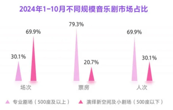 数据显示,专业剧场音乐剧票房占比达到总体票房的79.3%,场次占比仅为30.1%,而演艺新空间及小剧场的音乐剧场次占比则高达69.9%。