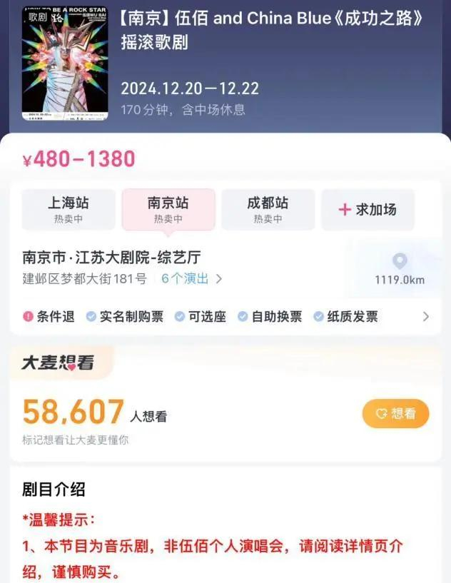 此外,南京站的购票页面也用红色字体新增提示:“本节目为音乐剧,非伍佰个人演唱会,请阅读详细页介绍,谨慎购买。”