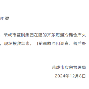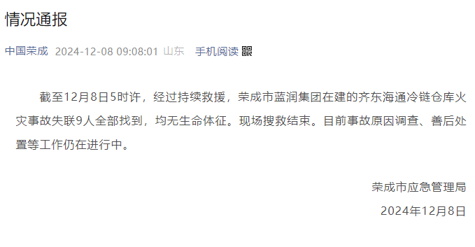 8日9时8分,情况通报:截至12月8日5时许,经过持续救援,荣成市蓝润集团在建的齐东海通冷链仓库火灾事故失联9人全部找到,均无生命体征。现场搜救结束。目前事故原因调查、善后处置等工作仍在进行中。