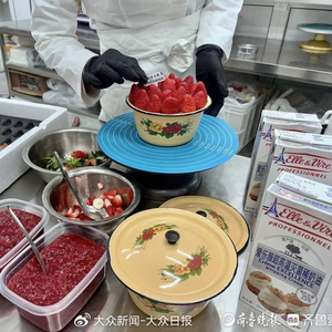 在大明湖附近的一家甜品店内,搪瓷盆草莓蛋糕同样成了店内主推产品,6英寸蛋糕售价为238元/盆。操作台上,店主朱女士用复古搪瓷盆作为容器,装上满满一层草莓点缀成蛋糕。“一开始抱着试试看的心态上架了产品,没想到这么火。”朱女士说,“一天至少卖出三四十盆,预计能火到元旦。”