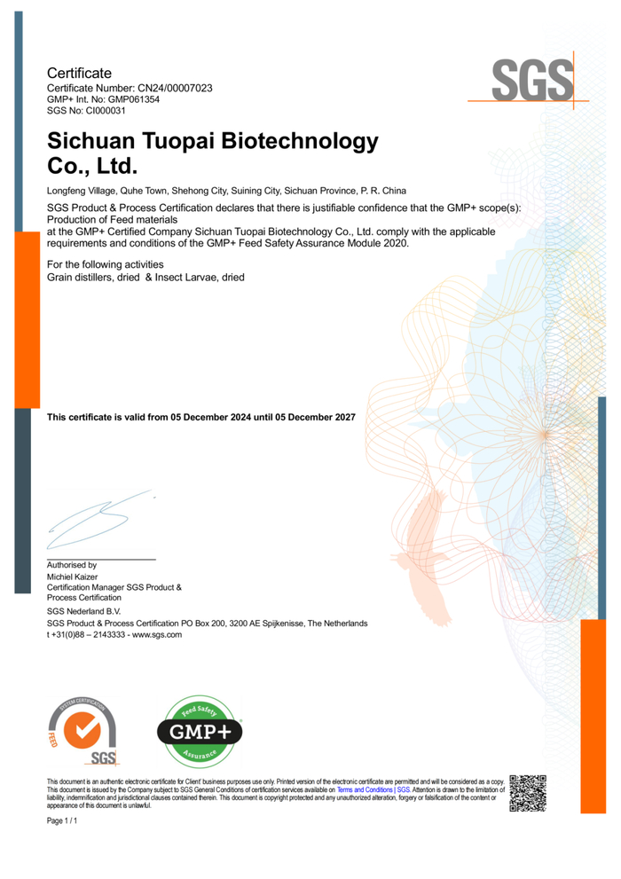 此次获得GMP+认证,不仅是对沱牌生物科技的产品安全质量和管理水平的肯定,也是对整个黑水虻昆虫蛋白饲料行业安全标准的提升,改变国外同行对国产黑水虻昆虫品质的怀疑,将有助于沱牌生物科技产品的品牌形象提升,更有助于打开高端昆虫蛋白市场的大门。