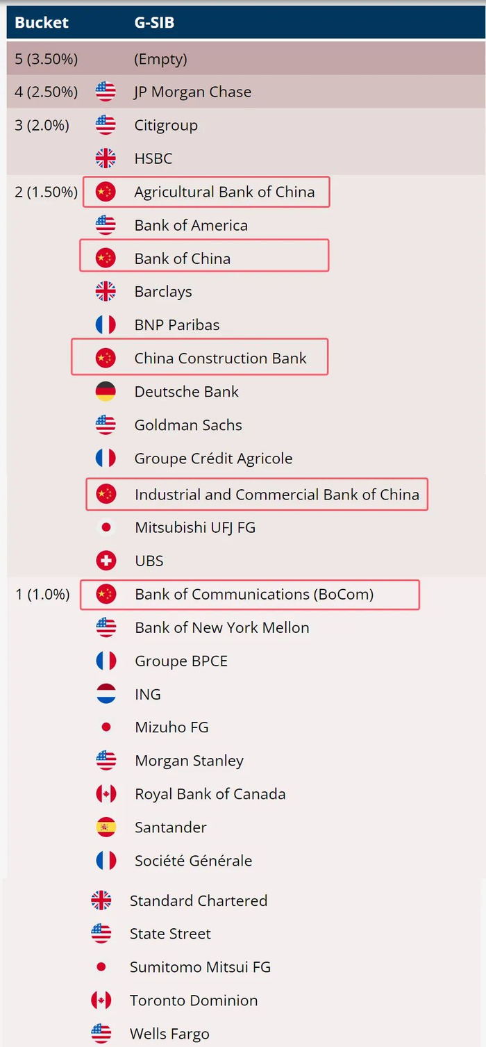 G-SIBs把入围的29家银行按照重要性从低到高分为五组,第五组为最高等级,第一组为最低等级,今年第五组仍然空缺,第四组只有一家银行,就是摩根大通(JP Morgan Chase),第三组有两家,分别是花旗(Citigroup)与汇丰(HSBC)。