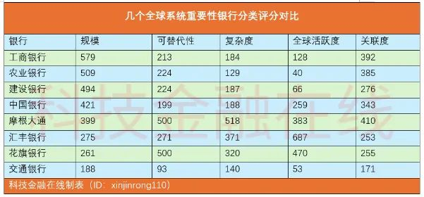 在复杂度维度上打分,摩根大通是518分,花旗银行是320分,汇丰银行是371分。而工行是184分,中行是188分,农行是129分,建行是187分,交通银行是140分。