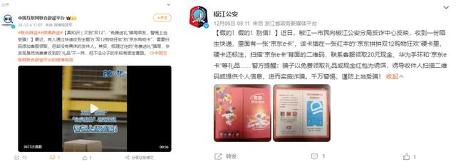 12月6日,京东礼品卡官方微信号发布《谨防诈骗!这种伪造的京东礼品卡不可信!》的反诈声明。“我们发现有不法分子以京东双十一促销、京东拼拼双十二促销、京东2024政府家电补贴活动等名义伪造卡片,冒充京东礼品卡/京东E卡/京东超市卡向用户邮寄,假借刮奖兑奖、赠送小礼品等形式,诱导用户扫描卡片背面印制的二维码进入仿冒的‘京东客服’聊天窗口,之后逐步引导刷单做任务领取奖励,骗取客户资金。在此提示,京东从未组织此类活动,请大家切勿轻信,谨防受骗。”