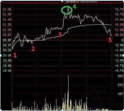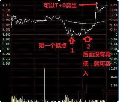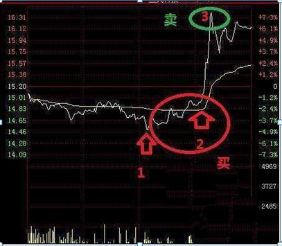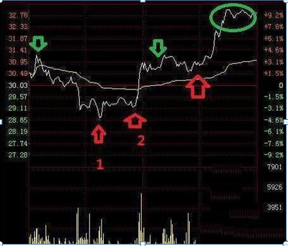 如图,开盘后在低位震荡,但低点在一路抬高,那么在接近翻红时,买点2可以买入股票,后面如直线拉升的话,只要2~3个点以上,就要择机卖出了。假如买2错过机会的,不要追了,等直线拉升6个点左右,不能再往上冲的话,可以考虑把手中的股票卖掉一点,等它下跌调整时再买进。