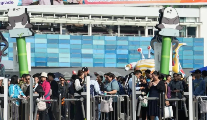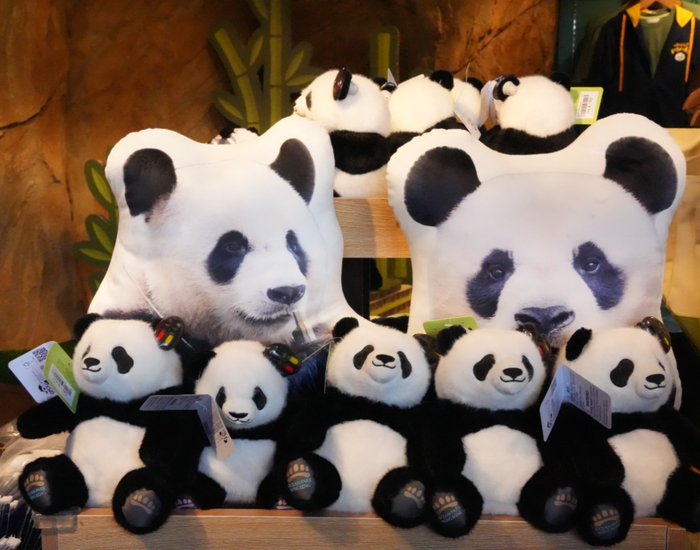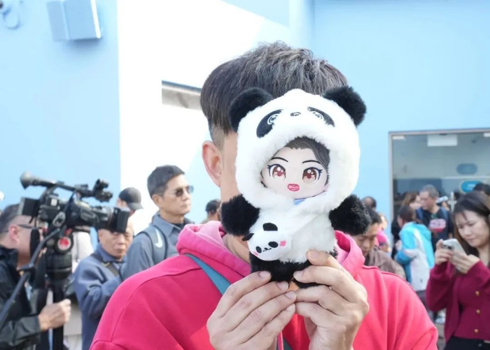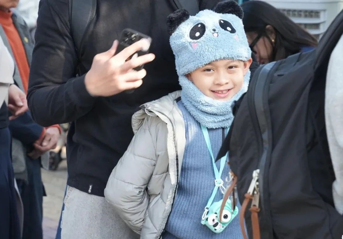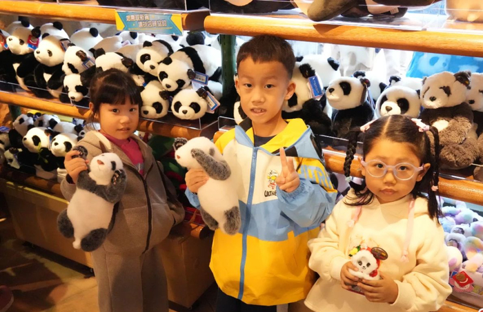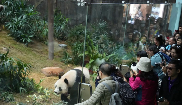 熊猫热潮席卷全港,吸引大批游客。馆外,不少市民手里拿着大熊猫手办,有小朋友带着毛茸茸的大熊猫帽子,还有市民背着挂满大熊猫玩偶的背包。