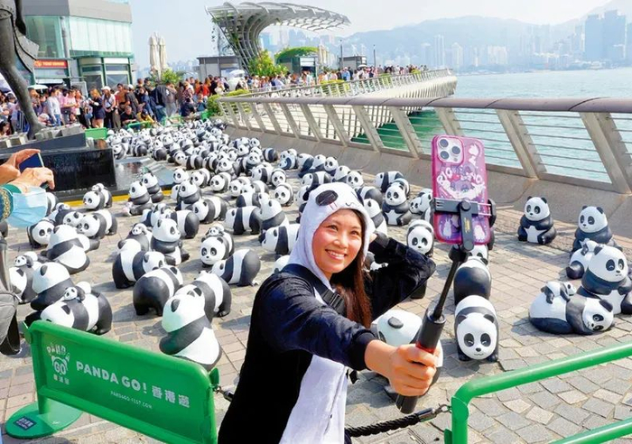 昨日(7日)尖沙咀的大熊猫主题展览现场,游人摩肩接踵,不少人手持熊猫公仔或穿戴着大熊猫服饰。来自深圳的旅客段先生说:“这次来到香港觉得街上特别热闹,很有节日氛围。”