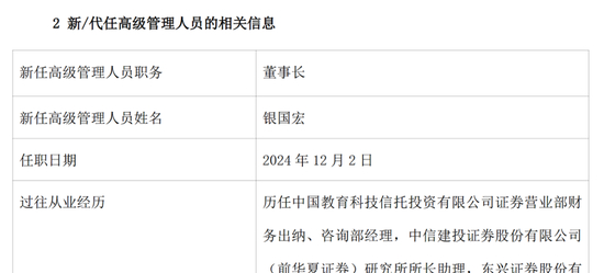 12月3日,新华基金发布基金行业高级管理人员变动公告,董事长于春玲因个人原因,已于12月2日辞任董事长职务,同时,公司任命银国宏为新任董事长。