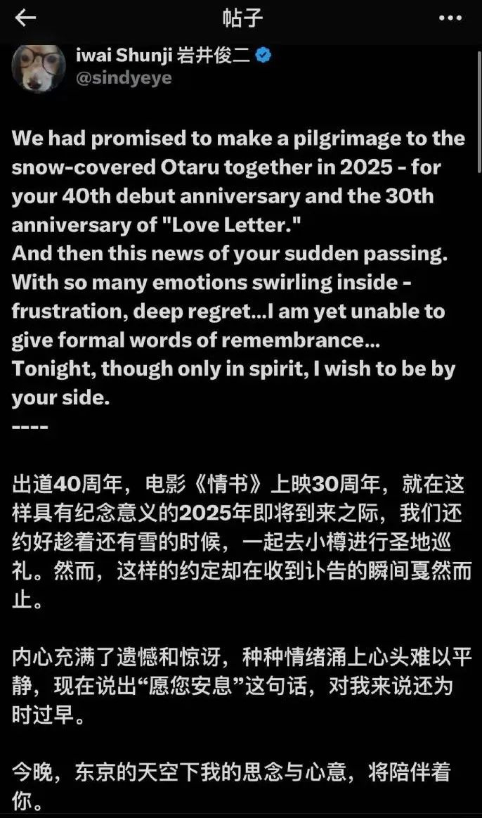 中山美穗去世当天,《情书》导演岩井俊二发文悼念:“出道40周年,电影《情书》上映30周年,就在这样具有纪念意义的2025年即将到来之际,我们还约好趁着还有雪的时候,一起去小樽进行圣地巡礼。然而,这样的约定却在收到讣告的瞬间戛然而止。内心充满了遗憾和惊讶,种种情绪涌上心头难以平静,现在说出‘愿您安息’这句话,对我来说还为时过早。今晚,东京的天空下我的思念与心意,将陪伴着你。”