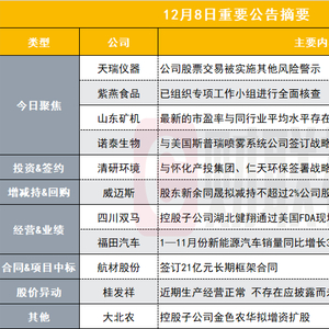 天瑞仪器公告,公司于2024年12月6日收到中国证监会出具的《行政处罚事先告知书》,公司未按照会计准则规定确认政府与社会资本合作模式项目(PPP项目)建造服务收入,导致2021年年度报告少计营业收入6.14亿元,少计营业成本6.12亿元,少计利润总额252.09万元,证监会拟对公司给予警告,并处以300万元罚款等。深圳证券交易所将对公司股票实施其他风险警示。公司股票自2024年12月9日开市起停牌一天,自2024年12月10日开市起复牌。自2024年12月10日起,公司股票简称由“天瑞仪器”变更为“ST天瑞”,证券代码仍为“300165”,股票交易的日涨跌幅限制不变,仍为20%。