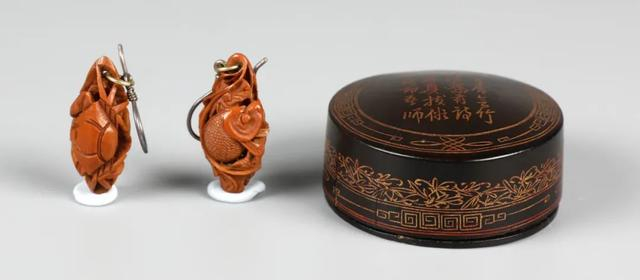 “鱼戏荷叶 八方来财”耳环带漆盒,清晚期,高3.1厘米,直径1.4厘米,总重3.5克;盒直径4.9厘米,高2.6厘米,重18.7克