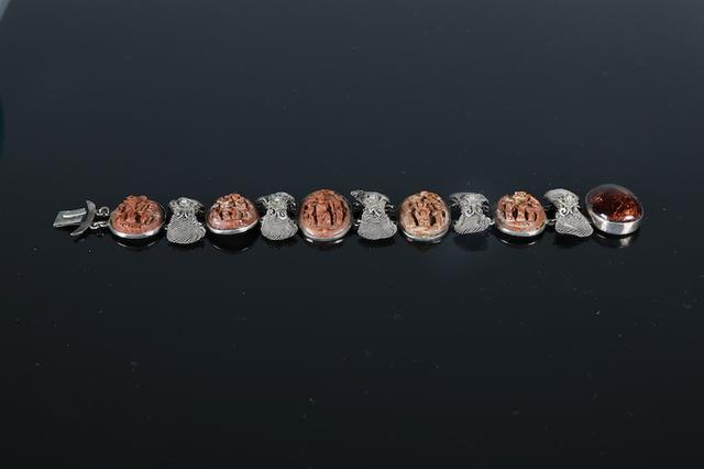 金银器手链是广作外销金银器的一个品种,金银往往镶嵌各种珍贵材质的雕刻作品,如象牙、榄核、珊瑚、宝石等。这件“清银累丝花卉纹镶核雕戏文故事手链”,长19.9厘米,宽2.3厘米,采用银累丝制成,一端镶嵌有宝石,间隔5个椭圆形托,托内镶嵌核雕戏文故事。作品雕刻精细,制作精美,色彩雅致,造型美观。